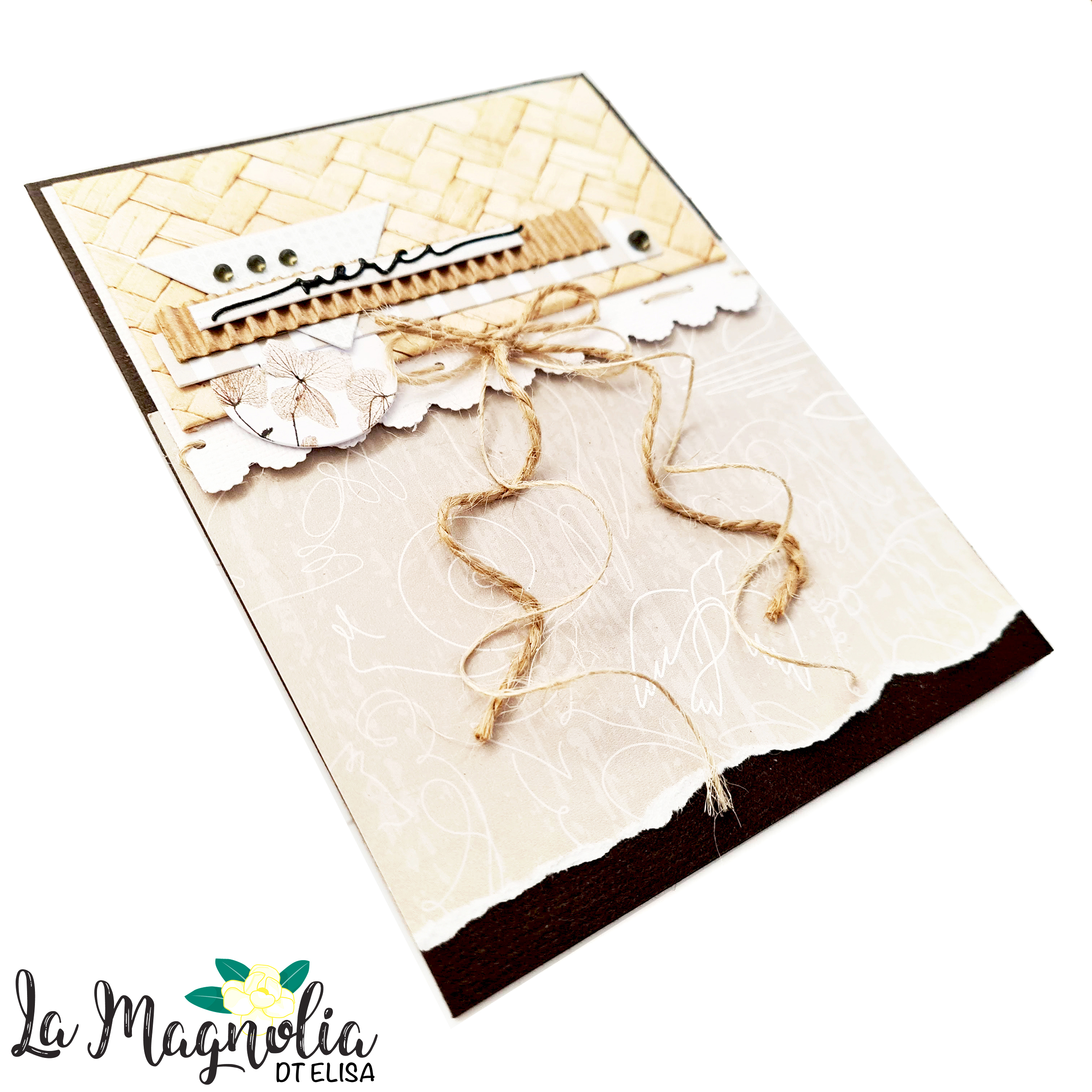 Come vedete, oltre alle carte, ho dovuto solamente aggiungere del Bazzill Java per la base della card, due cordini di Juta, uno più sottile dell'altro, delle mezzeperle ModaScrap Black Matte e un po' di cartoncino millerighe.